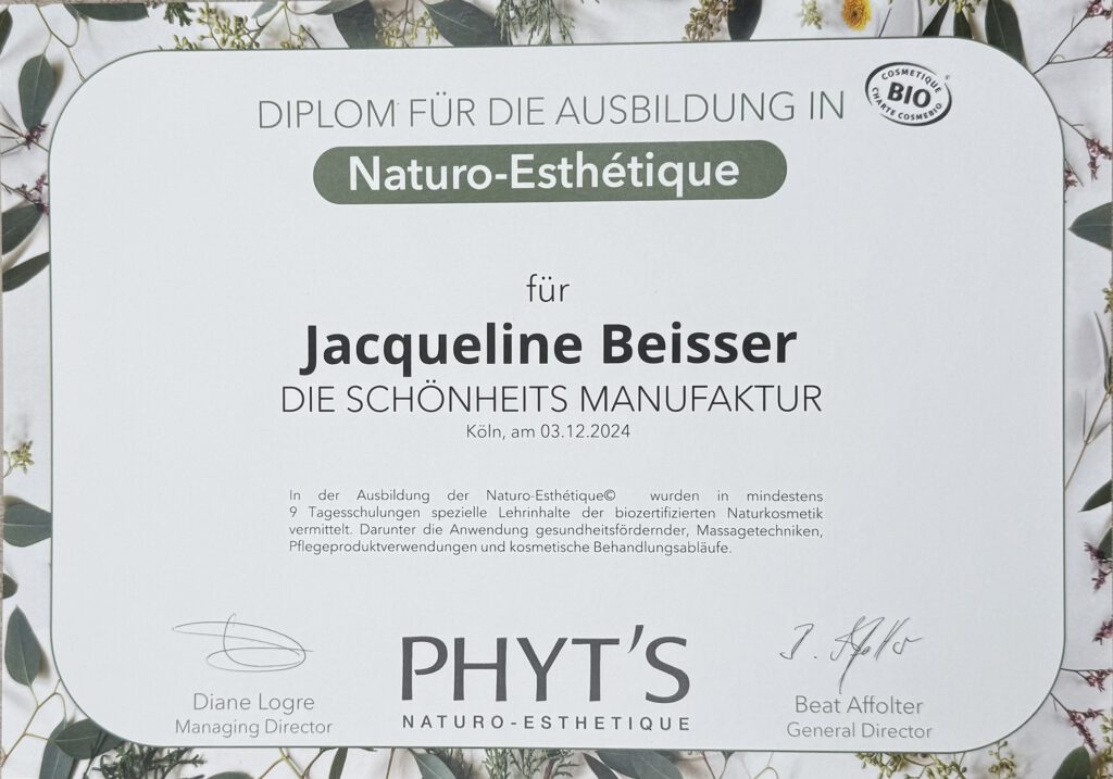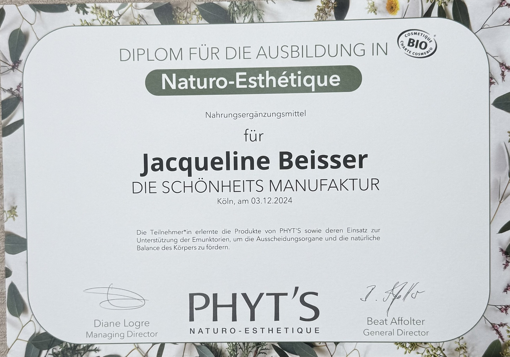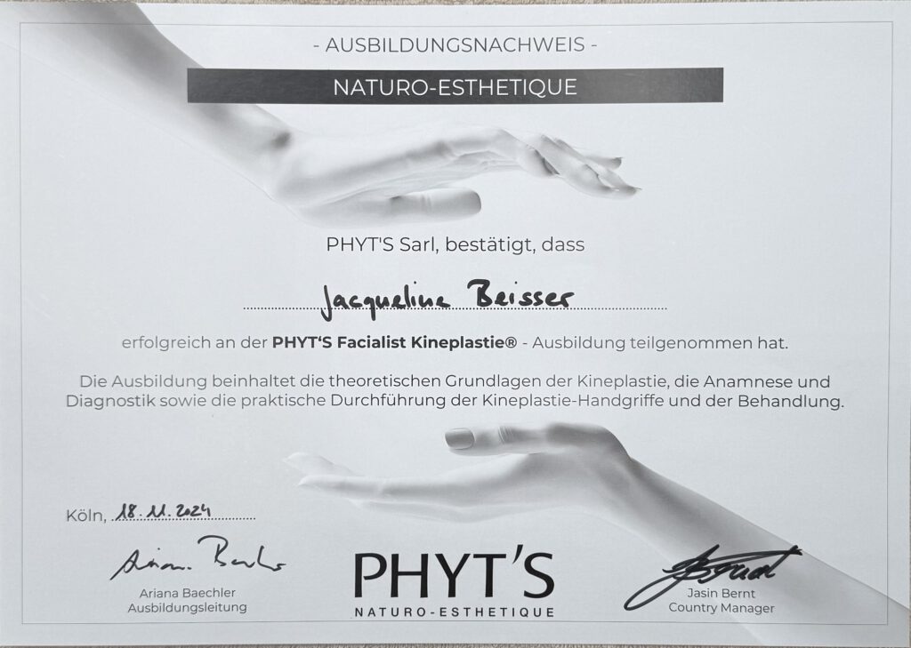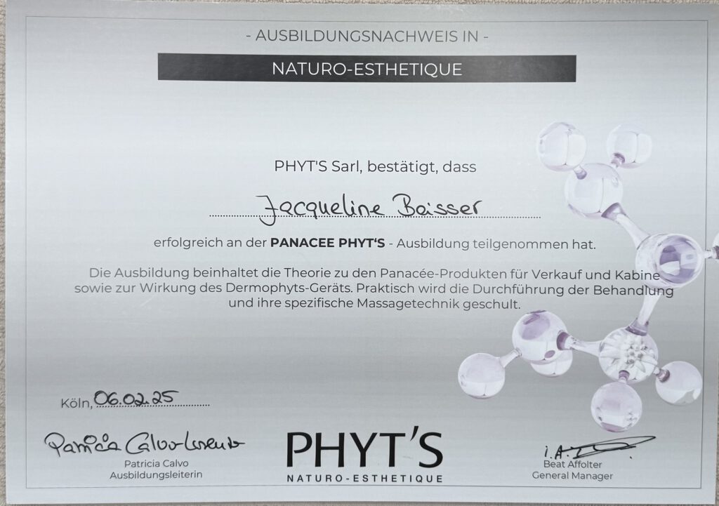Zertifikat für Spezifische Behandlungen wie Rosazea, Pigmentflecken und Sensible Haut der Firma Naturkosmetikfirma Phyt´s