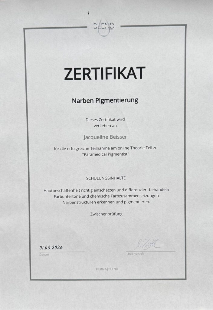 Zertifikat zur Ausbildung der paramedizinischen Narbenpigmentierung